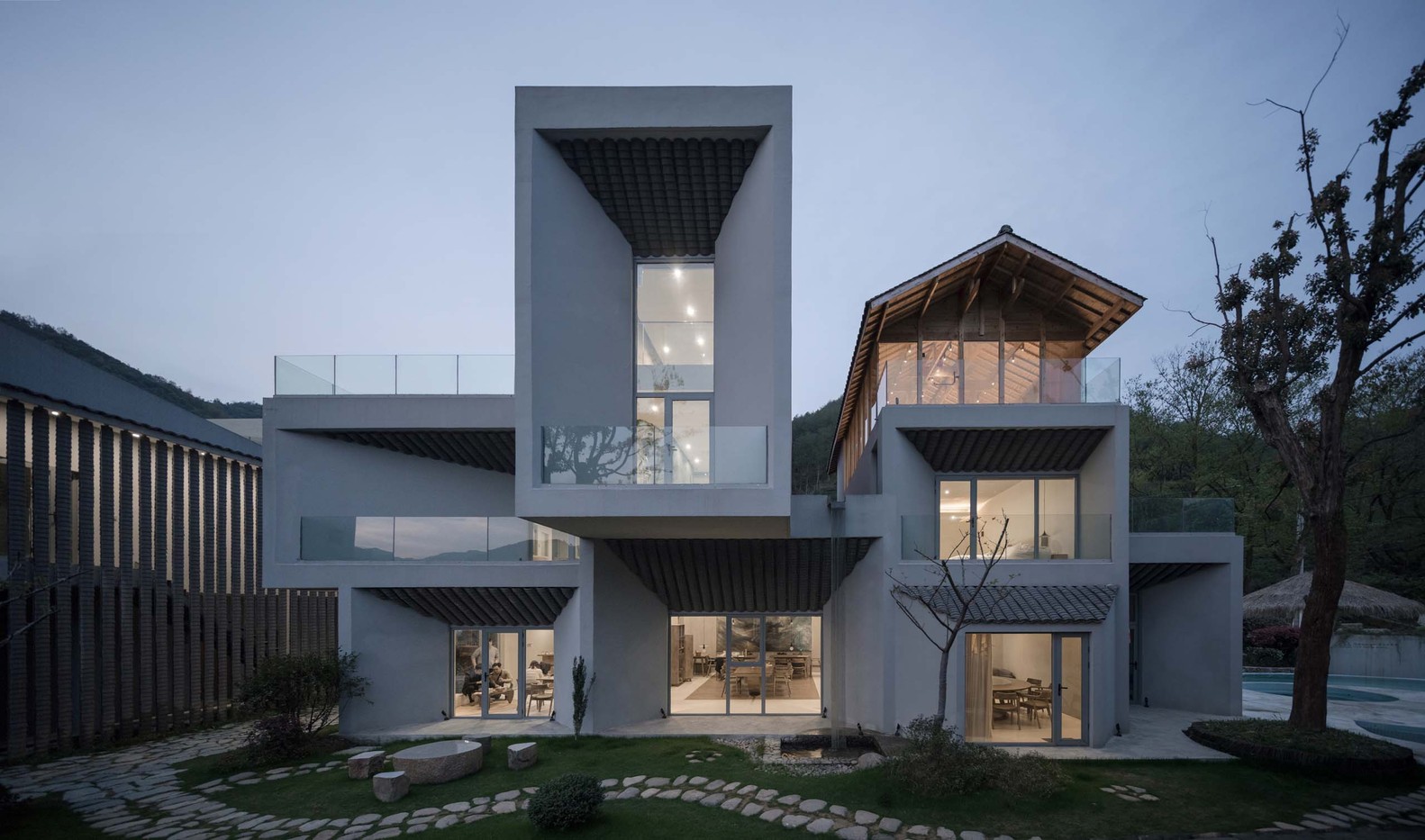 山澗房采用清水混凝土材料建造而成,由具體的使用需求,場地中形成了三棟建筑單體,同時也是三個不同姿態(tài)的“山”。因場地紅線的限制,呈三角形布局。前山平緩,橫向舒展。后山高聳,撲面而來。側山則臥于一側。角落一圓形“月塘”,成為實際功能中的泳池。自河對岸遠望,前山后山形成“深遠”之勢,自內庭仰看后山,如“高遠”而望,氣勢突兀,山勢逼人。對山而望,三個人造山同背后自然遠山層巒疊嶂,以崇山復嶺,密樹深溪的景象形成“平遠”之意。山澗之間,遙望一間木屋,屋下仿佛有瀑布跌入溪澗,是畫意中點睛之筆。
