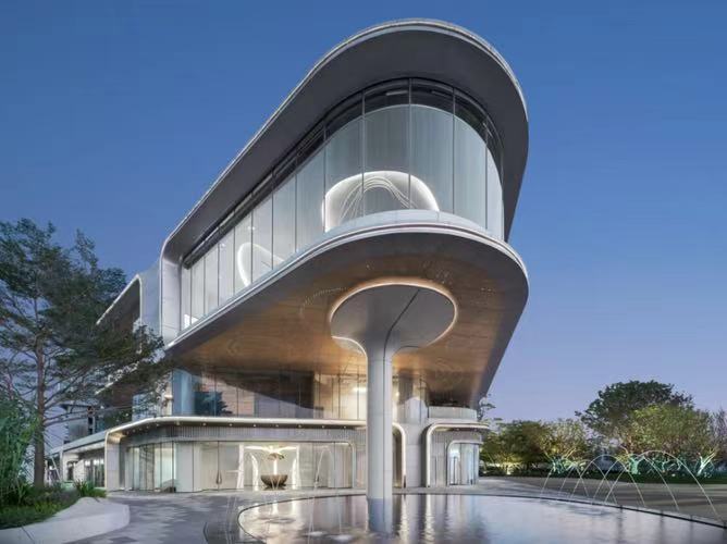 得益于UHPC優(yōu)異的材料屬性,能制作大規(guī)格及大異型的預(yù)制構(gòu)件,為建筑幕墻裝飾行業(yè)帶來了更多的可行性。完工后的柱體造型流暢,美觀獨(dú)特,現(xiàn)代輕奢。窄橫縫、寬豎縫的建筑成品更給人視覺上”無橫縫“的效果。UHPC表面質(zhì)地細(xì)膩,讓其融入水景,與水面景觀相輔相成,互相促進(jìn)。