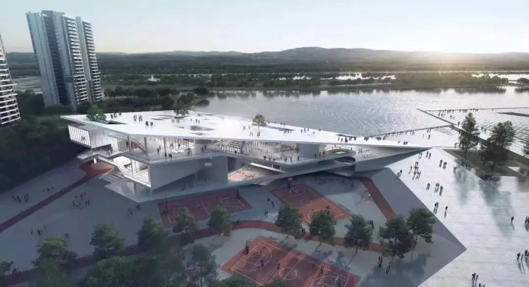 體育館項目包括一棟4層的綜合體育館和一棟室內(nèi)籃球館,兩棟建筑之間地下負一層相連通,地上設計了半籃球場、跑道等運動場地及設施。體育館屋面是可上人屋面,給市民提供一個休閑觀光的公共平臺。在建筑底部與水相接的地方,設計了一個與東江直接相連的無邊游泳池,建成后將是河源高新區(qū)一道靚麗的新景觀、新地標!