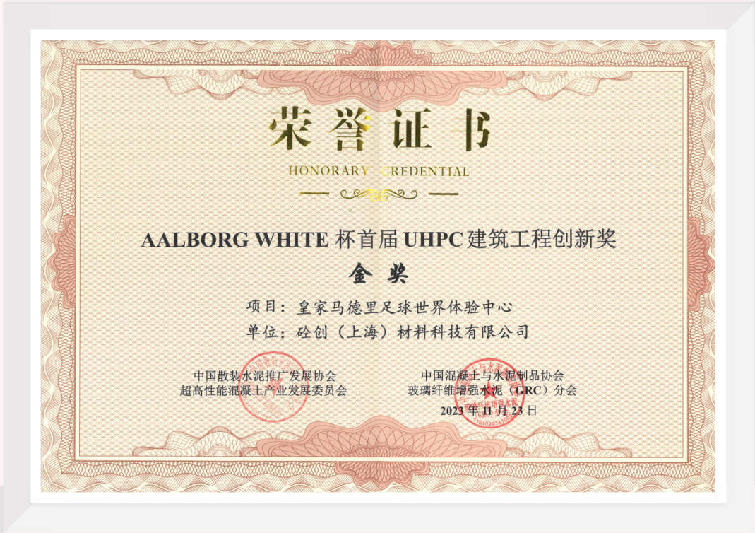 砼創(chuàng)(上海)新材料科技有限公司在此次參賽中摘得一金一銀的好成績(jī)。UHPC參賽項(xiàng)目:皇家馬德里足球世界體驗(yàn)中心,獲得“首屆UHPC建筑工程創(chuàng)新獎(jiǎng)-金獎(jiǎng)”;GRC參賽項(xiàng)目:寧波工業(yè)互聯(lián)網(wǎng)研究院產(chǎn)業(yè)園獲得“首屆GRC建筑工程創(chuàng)新獎(jiǎng)-銀獎(jiǎng)”。