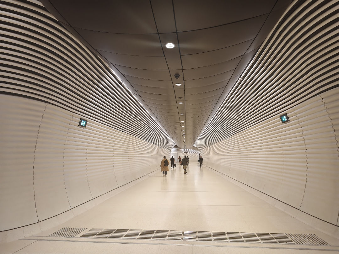 Martin Place站是悉尼地鐵的標(biāo)志性站點(diǎn),項(xiàng)目同樣也是采用GRC幕墻材料,其裝飾設(shè)計(jì)體現(xiàn)了GRC材料的技術(shù)創(chuàng)新。車站采用大尺度GRC曲面吊頂尤為引人注目,通過精確的模具制作和安裝技術(shù),營造出美觀的整體效果,進(jìn)一步提升了材料的性能和表現(xiàn)力。GRC材料的輕質(zhì)特性使得大跨度吊頂成為可能,同時其良好的聲學(xué)性能提升了車站的聲環(huán)境質(zhì)量。