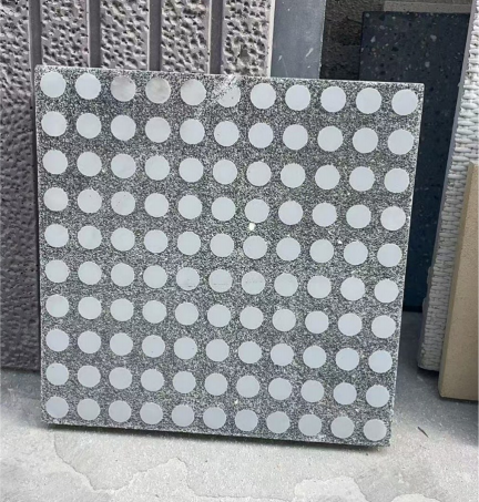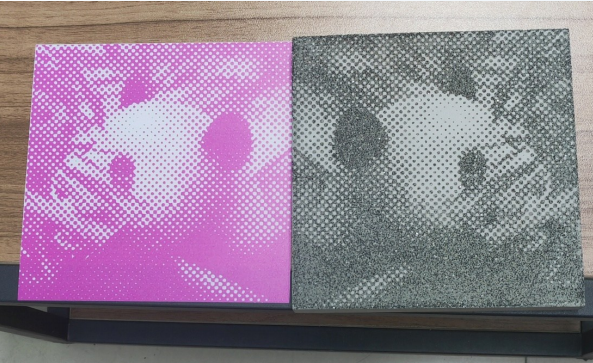 原理:將圖片處理后使用印刷設(shè)備印刷到 防水紙或膜上,其中印刷油墨中包含特殊的水泥緩凝劑,制成緩凝成像膜。再使用緩凝成像膜制作混凝土板,使得混凝土板上圖案區(qū)域骨料露出,與無圖案部分的水泥基色形成對比,產(chǎn)生圖案效果。圖案由圖案部分露出的骨料與無圖案部分正常水泥石的顏色色差對比形成。緩凝成像技術(shù)制成的圖像混凝土,圖案從任意角度觀察都清晰可見。